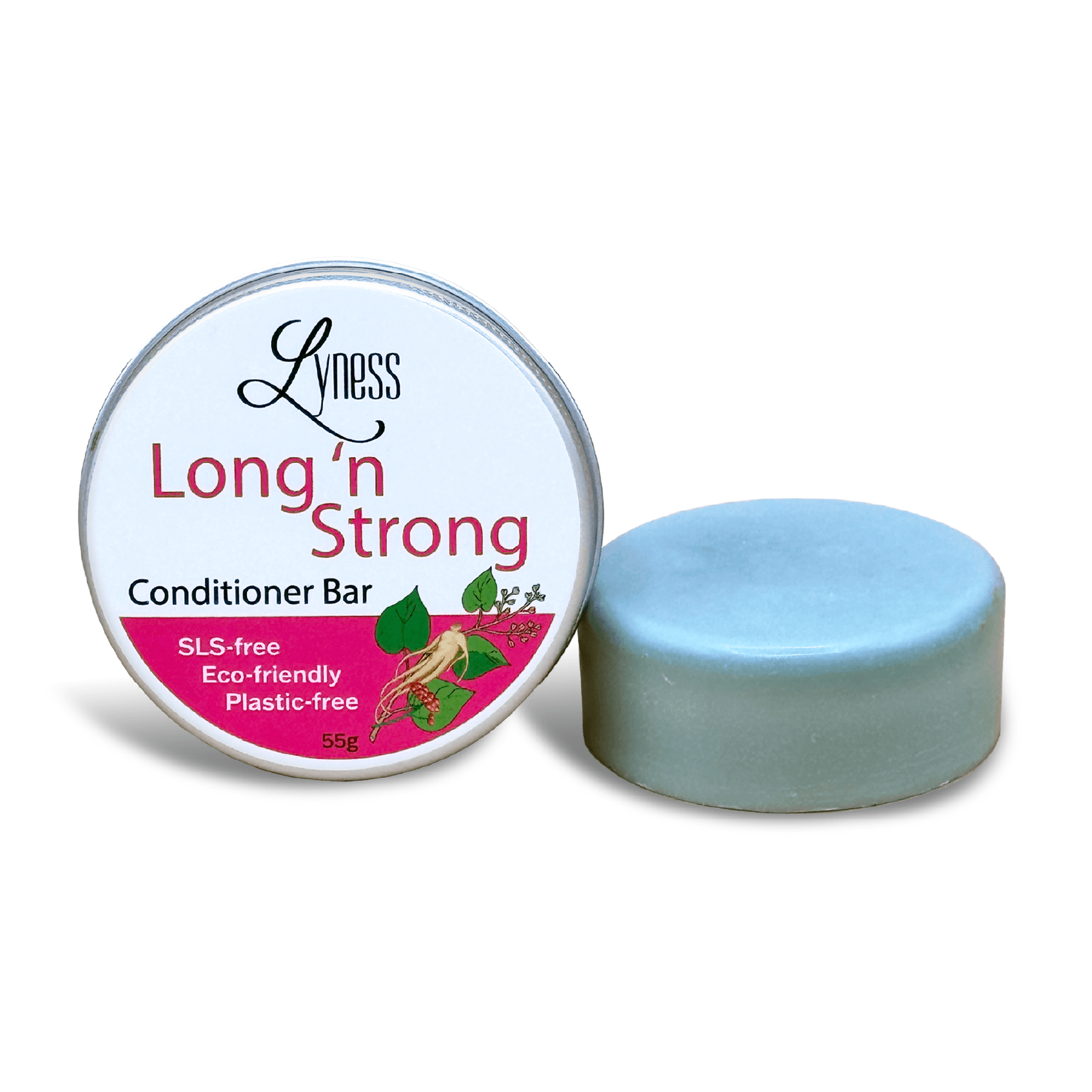 Lyness Long n' Strong Shampoo & Conditioner bars stimulate your hair follicles to maximize growth. Ginseng boosts circulation to the scalp, helping deliver oxygen and nutrients to hair follicles. Peppermint oil adds a cooling effect while stimulating blood flow, creating the ideal environment for growth. Amla oil nourishes roots, while D-Panthenol strengthens hair shafts for thicker, healthier growth over time. The result is fuller, stronger-looking hair.